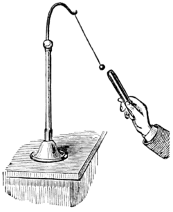 In the progress of the science it came to be known that certain substances are able to carry away the peculiar influence produced, while others are unable to do so; the former are called conductors, and the latter non-conductors, or insulators, of electricity. To make the distinction apparent, let us take a metal rod, having a glass stem attached to it, and rub the glass stem with a piece of silk, care being taken that both silk and glass are warm and dry. We shall find that the glass has now acquired the property of attracting little bits of paper, or elder pith; but only where it has been rubbed, for the peculiar influence acquired by the glass has not been able to spread itself over the surface.
