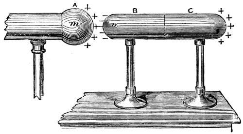 supported on glass stems. These two vessels are supposed to be in contact, but at the same time to be capable of being separated from one another at their middle point, where the line is drawn in Fig. 6. Now let us cause B and C to approach A together. At first, B and C are not electrified, that is to say, their two electricities are not separated from each other, but are mixed together; but mark what will happen as they are pushed towards A. The positive electricity of A will decompose the two electricities of B and C, attracting the negative towards itself, and repelling the positive as far away as possible. The disposition of electricities will, therefore, be as in the figure. If we now pull C away from B, we have obtained a quantity of positive electricity on C, by help of the original electricity which was in A; in fact, we have made use of the original stock or electrical capital in A, in order to obtain positive electricity in C, without, however, diminishing the amount of our original stock. Now, this distant action or help, rendered by the original electricity in separating that of B and C, is called electric induction.