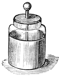 In this case, an instrument called a Leyden jar is very frequently employed. It consists of a glass jar, coated inside and outside with tin foil, as in Fig. 7. A brass rod, having a knob at the end of it, is connected metallically with the inside coating, and is kept in its place by being passed through a cork, which covers the mouth of the jar. We have thus two metallic coatings which are not electrically connected with one another. Now, in order to charge a jar of this kind, let the outside coating be connected by a chain with the earth, while at the same time positive electricity from the prime conductor of an electrical machine is communicated to the inside knob.