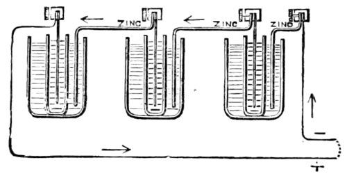 92. It is not our object here to give a complete description, either historical or scientific, of the voltaic battery, but rather to give such an account as will enable our readers to understand what the arrangement is, and what sort of effect it produces; and with this object we shall at once proceed to describe the battery of Grove, which is perhaps the most efficacious of all the various arrangements for the purpose of producing an electric current. In this battery we have a number of cells connected together, as in Fig. 8, which shows a battery of three cells. Each cell consists of two vessels, an outer and an inner one; the outer vessel being made of glass or ordinary stone ware, while the inner one is made of unglazed porcelain, and is therefore porous. The outer vessel is filled with dilute sulphuric acid, and a plate of amalgamated zinc—that is to say, of metallic zinc having its outer surface brightened with mercury,—is immersed in this acid. Again, in the inner or porous vessel we have strong nitric acid, in which a plate of platinum foil is immersed, this being at the same time electrically connected with the zinc plate of the next outer vessel, by means of a clamp, as in the figure. Both metals must be clean where they are pressed together, that is to say, the true metallic surfaces of both must be in contact. Finally, a wire is metallically connected with the platinum of the left-hand cell, and a similar wire with the