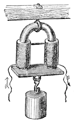 Fig. 9.97. In the next place, the current is able, not merely to deflect a magnet, but also to render soft iron magnetic. Let us take, for instance, the wire connected with the one pole of the battery, and cover it with thread, in order to insulate it, and let us wrap this wire round a cylinder of soft iron, as in Fig. 9. If we now make a communication between the other extremity of the wire, and the other pole of the battery, so as to make the current pass, it will be found that our cylinder of soft iron has become a powerful magnet, and that if an iron keeper be attached to it as in the figure, the keeper will be able to sustain a very great weight.