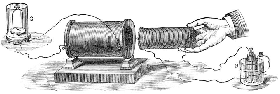 104. In order to exemplify this induction of currents, it is not even necessary to make and break the current in the right-hand coil, for we may keep it constantly going and arrange so as to make the right-hand coil (always retaining its connection with the battery) alternately approach and recede from the other; when it approaches the other, the effect produced will be the same as when the contact was made in the above experiment—that is to say, we shall have an induced current in an opposite direction to that of the primary, while, when it recedes from the other, we shall have a current in the same direction as that of the primary.