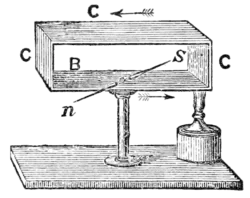 Again, we learn from Art. 100 that two currents going in opposite directions repel one another. The current generated in the coil attached to the galvanometer or secondary current will, therefore, repel the primary current, which is moving towards it; this repulsion will either cause a stoppage of motion, or render necessary the expenditure of energy, in order to keep up the motion of this moving coil. We thus find that two phenomena occur simultaneously. In the first place, there is the production of energy in the secondary coil, in the shape of a current opposite in direction to that of the primary coil; in the next case, owing to the repulsion between this induced current and the primary current, there is a stoppage or disappearance of the energy of actual motion of the moving coil. We have, in fact, the creation of one species of energy, and at the same time the disappearance of another, and thus we see that the law of conservation is by no means broken.