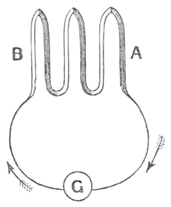 173. This energy is transmuted into that of visible motion when two wires conveying electrical currents in the same direction attract each other. When, for instance, two circular currents float on water, both going in the direction of the hands of a watch, we have seen from Art. 100 that they will move towards each other. Now, here there is, in truth, a lessening of the intensity of each current when the motion is taking place, for we know (Art. l04) that when a circuit is moved into the presence of another circuit conveying a current, there is produced by induction a current in the opposite direction; and hence we perceive that, when two similar currents approach each other, each is diminished by means of this inductive influence—in fact, a certain amount of current energy disappears from existence in order that an equivalent amount of the energy of visible motion may be produced.