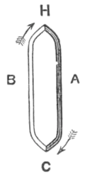 Now, here we have an apparent anomaly, for the circuit is cooling—that is to say, it is losing energy—but at the very same time it is manifesting energy in another shape, namely, in that of an electric current, which is circulating round it. Clearly, then, some of the heat of this circuit must be spent in generating this current; in fact, we should expect the circuit to act as a heat engine, only producing current energy instead of mechanical energy, and hence (Art. 152) we should expect to see a conveyance of heat from the hotter to the colder parts of the circuit. Now, this is precisely what the current does, for, passing along the hotter junction, in the direction of the arrow-head, it cools that junction, and heats the colder one at C,—in other words, it carries heat from the hotter to the colder parts of the circuit. We should have been very much surprised had such a current cooled C and heated H, for then we should have had a manifestation of current energy, accompanied with the conveyance of heat from a colder to a hotter substance, which is against the principle of Art. 152.