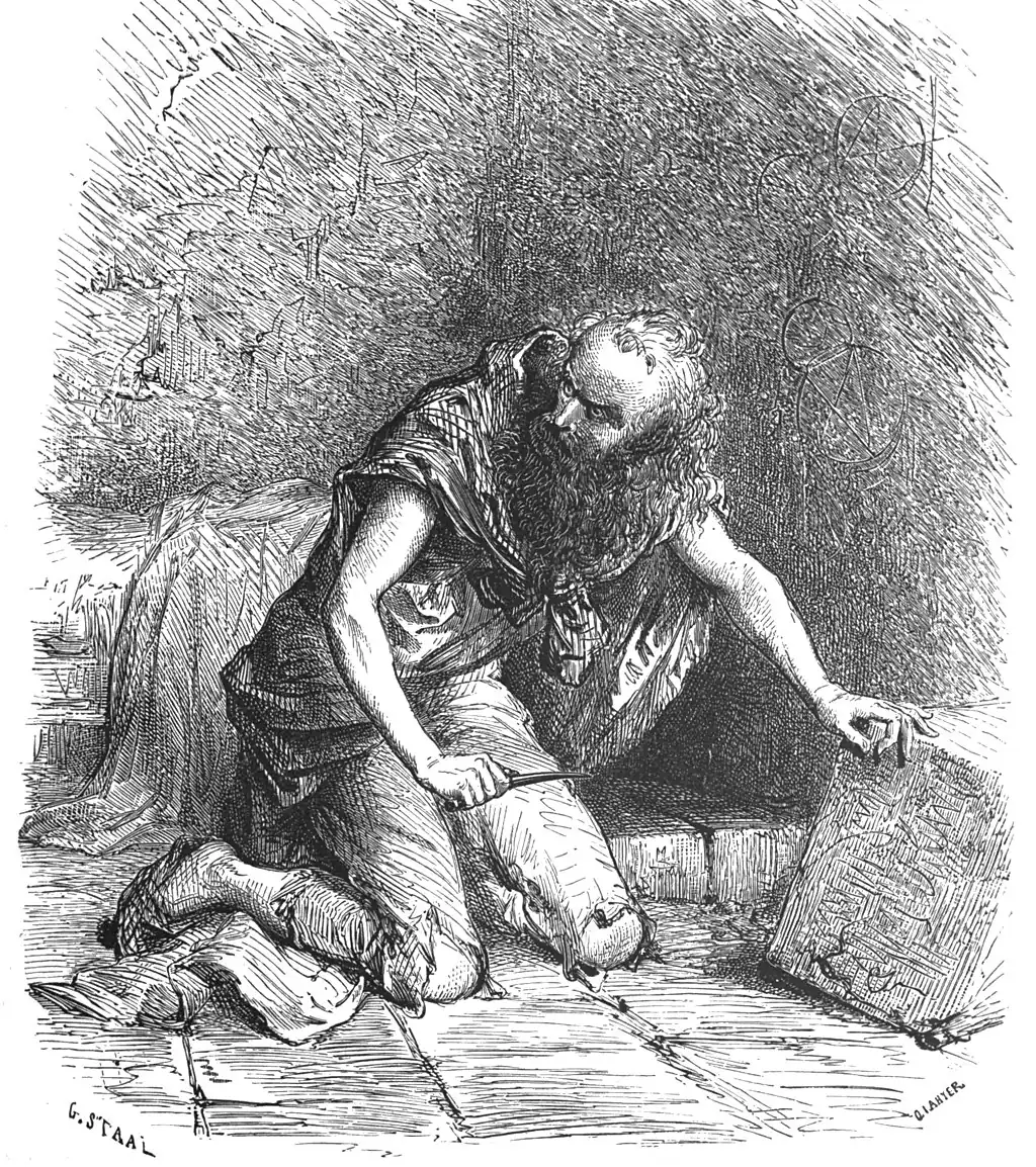 plaster detached from the wall, sat a man whose tattered garments scarcely covered him. He was drawing in this circle geometrical lines, and seemed as much absorbed in his problem as Archimedes when the soldier of Marcellus slew him. He did not move at the sound of the door, and continued his problem until the flash of the torches lighted up with an unwonted glare the somber walls of his cell; then, raising his head, he perceived with astonishment the number of persons in his cell. He hastily seized the coverlid of his bed, and wrapped it round him in order to appear in a more decent state to the strangers.