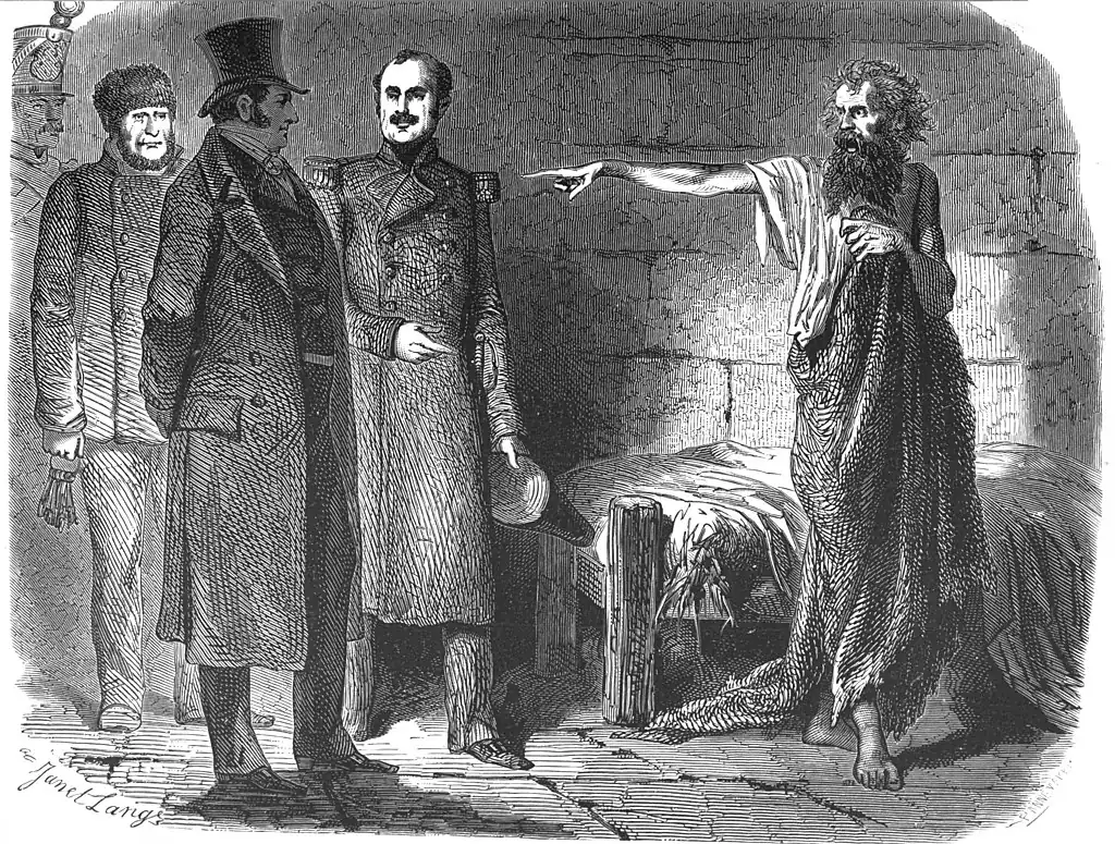 "You are right, sir," replied the governor; "and this remark proves that you have deeply considered the subject. Now, we have in a dungeon about twenty feet distant, and to which you descend by another stair, an old abbé, ancient leader of a party in Italy, who has been here since 1811, and in 1813 he went mad, and the change is astonishing. He used to weep, — he now laughs; he grew thin, — he now grows fat. You had better see him, for his madness is amusing."