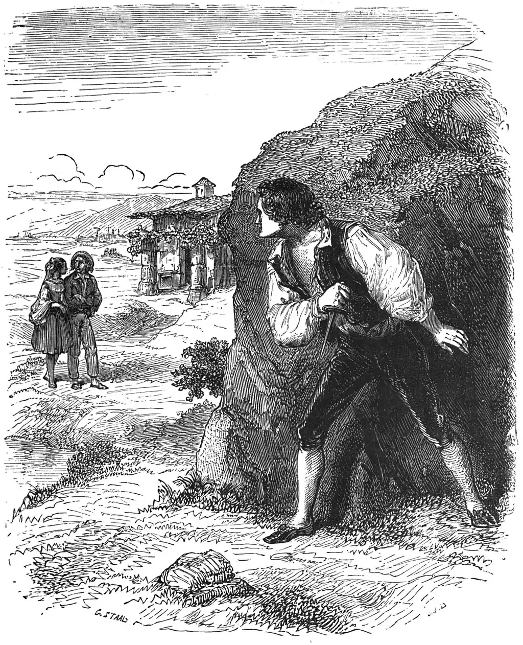 ANGLARS followed Edmond and Mercédès with his eyes until the two lovers disappeared behind one of the angles of Fort Saint Nicolas; then, turning round, he perceived Fernand, who had fallen, pale and trembling, into his chair, whilst Caderousse stammered out the words of a drinking-song.