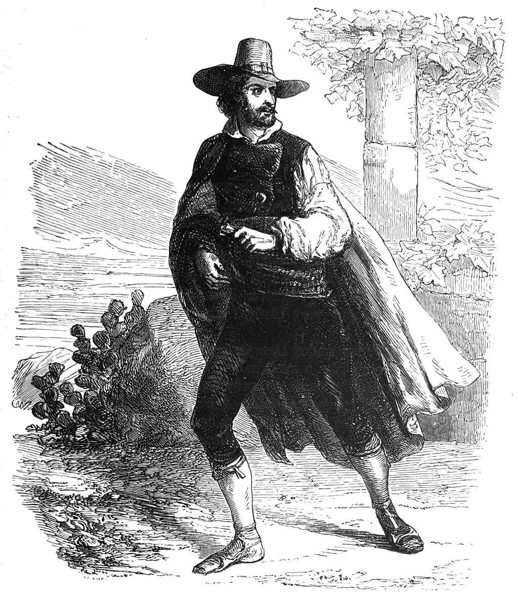 The old man was attired in a suit of black, trimmed with steel buttons beautifully cut and polished. His thin but still powerful legs were arrayed in a pair of richly embroidered clocked stockings, evidently of English manufacture, and smuggled, while from his three-cornered hat depended a long streaming knot of white and blue ribbons. Thus he came along, supporting himself on a stick, twisted its whole length like the ancient pedum. He might have been one of those mascadins who, in 1796, promenaded in the newly reopened gardens of the Luxemborg and Tuileries.