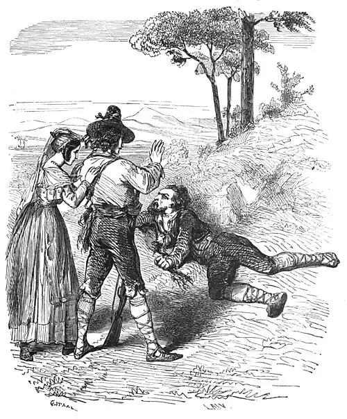 "The ravisher stopped suddenly, his knees bent under him, and lie fell with Teresa in his arms. The young girl rose instantly, but the man lay on the earth struggling in the agonies of death. Vampa then rushed toward Teresa; for at ten paces from the dying man her legs had failed her, and she had dropped on her knees, so that the young man feared that the ball that had brought down his enemy had also wounded his betrothed.