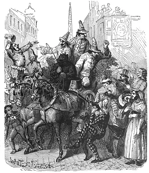 It is difficult to form an idea of the perfect change that had taken place. Instead of the spectacle of gloomy and silent death, the Piazza del Popolo presented a spectacle of gay and noisy mirth and revelry. A crowd of masks flowed in from all sides, issuing from the doors, descending from the windows. From every street and every turn drove carriages filled with pierrots, harlequins, dominoes, marquises, Transteverini, knights, and peasants, screaming, fighting, gesticulating, flinging eggs filled with flour, confetti, nosegays, attacking, with their sarcasms and their missiles, friends and foes, companions and strangers, indiscriminately, without any one taking offense, or doing anything else than laugh.