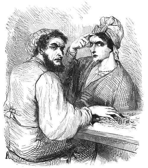 "There was evidently a severe struggle in the mind of Caderousse; it was evident that the small shagreen case, which he turned and re-turned in his hand, did not seem to him commensurate in value to the enormous sum which fascinated his gaze. He turned toward his wife.