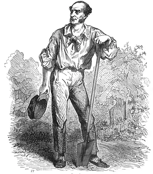 An old man, who was digging busily at one of the beds of roses, stuck his spade in the earth, and approached cap in hand, and striving to conceal a quid of tobacco he had just thrust into his cheek. A few locks of gray mingled with his hair, which was still thick and matted, whilst his bronze features and determined glance announced the old sailor who had braved the heat of the equator and the storms of the tropics.