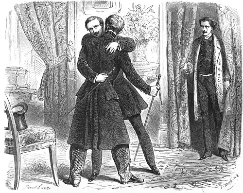 "I never once doubted your doing so." Monte-Cristo chose this moment for reëntering the drawing-room. On hearing the sound of his footsteps, the two men threw themselves in each other's arms; and, in the midst of this embrace, the count entered.
