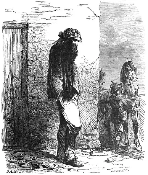 At that moment a hand touched his shoulder. The young man turned round, thinking that Danglars or Monte-Cristo had forgotten something they wished to tell him, and had returned just as they were starting. But instead of either of these he saw nothing but a strange face, sunburned, and encircled by a beard, with eyes brilliant as carbuncles, and a smile upon the mouth which displayed a perfect set of thirty-two white teeth, pointed and sharp as the wolf’s or jackal’s. A red handkerchief encircled his grayish hair; torn and filthy garments covered