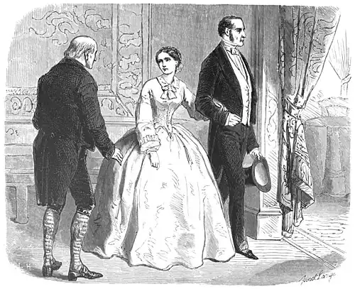 "Gentlemen," said he, in a tone strangely firm for a servant speaking to his masters under such solemn circumstances,―"gentlemen, M. Noirtier de Villefort wishes to speak immediately to M. Franz de Quesnel, baron d'Epinay." He, as well as the notary, that there might be no mistake in the person, gave all his titles to the bridegroom elect.