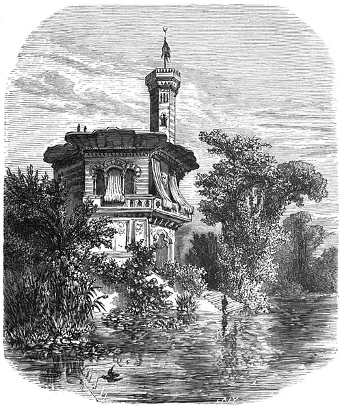 "It was toward this kiosk that we were rowing. A ground-floor, ornamented with arabesques, bathing its terraces in the water, and another floor, looking on the lake, was all which was visible to the eye. But beneath the ground-floor, stretching out into the island, was a large subterraneous cavern, to which my mother, myself, and the women were conducted. In this place were together 60,000 purses and 200 barrels; the purses contained 25,000,000 of money in gold, and the barrels were filled with 30,000 pounds of gun-powder.