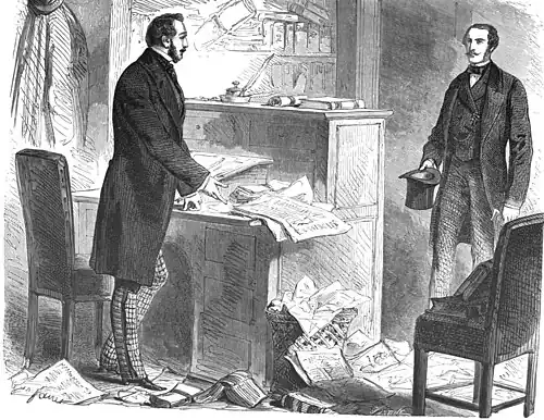 Morcerf took his hat, and left the room. He found his chariot at the door, and doing his utmost to restrain his anger, he drove at once to Beauchamp's house. Beauchamp was in his office. It was one of those gloomy, dusty-looking apartments, such as journalists' offices have always been. The servant announced Albert de Morcerf. Beauchamp repeated the name to himself, and then gave orders for him to be admitted. Albert entered.
