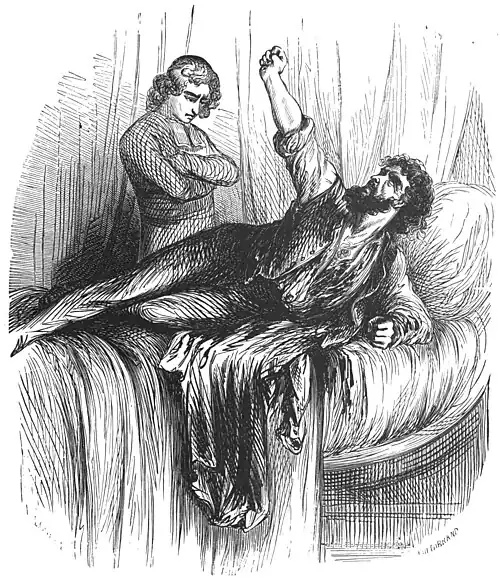 He fainted. Ali and his master conveyed the wounded man into a room. Monte-Cristo motioned to Ali to undress him, and he then examined his dreadful wounds.