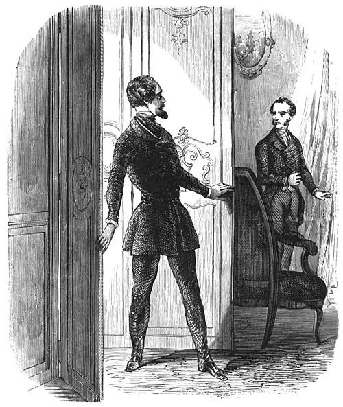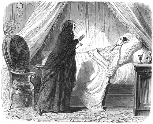 There was no occasion to push the door, it was wide open. A sob was the only sound he heard. He saw, as though in a mist, a black figure kneeling, and buried in a confused mass of white drapery. A terrible fear transfixed him. It was then he heard a voice exclaim, "Valentine is dead!" and another voice which, like an echo, repeated: