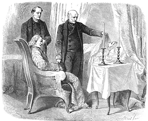 But, in less than five minutes, the staircase groaned beneath an extraordinary weight. Morrel was seen carrying, with superhuman strength, the arm-chair containing Noirtier upstairs. When he reached the landing, he placed the arm-chair on the floor and rapidly rolled it into Valentine's room. This could only have been accomplished by means of unnatural strength supplied by powerful excitement. But the most fearful spectacle was Noirtier being pushed toward the bed, His face expressing all his meaning, and his eyes supplying the want of | every other faculty. That pale face and flaming glance appeared to
