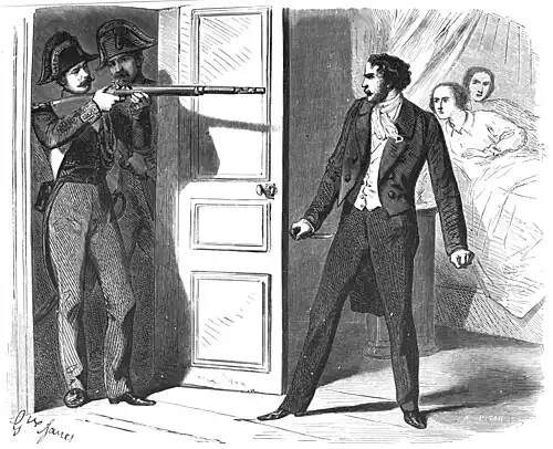The brigadier had put his eye to the key-hole, and had perceived Andrea standing and entreating. A violent blow from the butt end of the musket burst open the lock, two more forced out the bolts, and the broken door fell in. Andrea ran to the other door, leading to the gallery, ready to rush out; but he was stopped short; and he stood with his body a little thrown back, pale, and with the useless knife in his clinched hand.