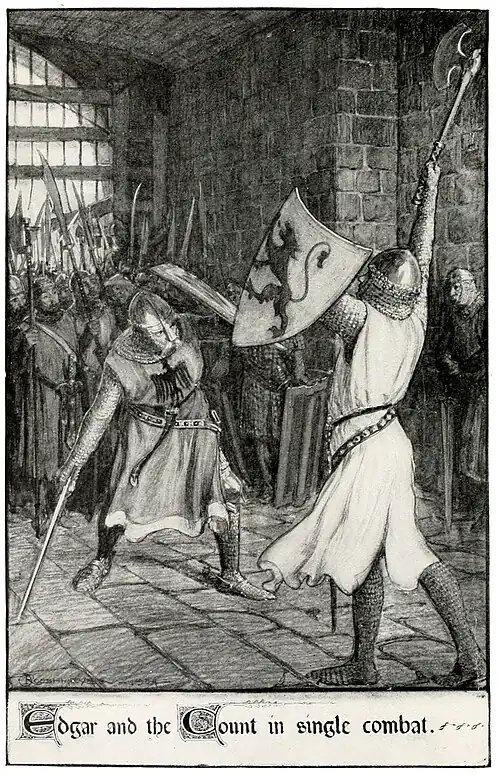 The Two Attacks Described—A Bridge of Logs—The Combat of the Archers—Serious Loss of Defenders—The Resistless Tower—The Count's Men Gain the Rampart—A Fight on the Wall—The Friar's Fire-Darts—The Tower Burns—Edgar Sore Pressed at the Breached Wall—Hand-to-Hand Fighting—A Swinging Ram—Grappling Hooks—The Portcullis Falls—The Combat Between Edgar and the Count—The Struggle Renewed—Retreat of the Garrison—The Victory of the Besiegers—A Pause,