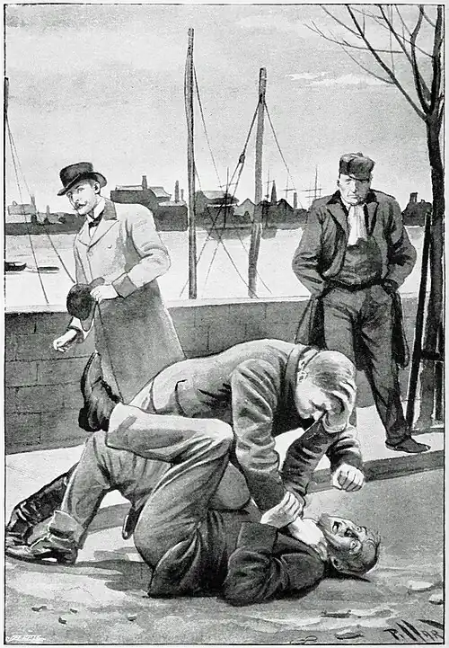 The dockman was as big as the navvy, and no more patient. He immediately punched his assailant's nose; and in three seconds a mingled bunch of dockman and navvy was floundering about the street. Dorrington saw no more. He had the despised hat in his hand, and, general attention being directed to the action in progress, he hurried quietly up the nearest court.