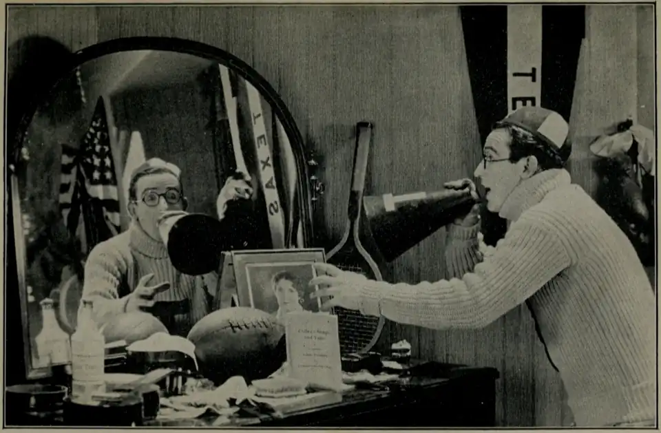 The first scene disclosed Lester Laurel, wearing a huge white sweater with a large block "Y" on it and bearing golf sticks, a tennis racket, a mandolin and a suitcase, in the act of alighting from the train to begin his career at Yates College. The attire of the hero was vaguely disturbing to Harold, for it struck him as a trifle immodest for an entering man. Moreover, Laurel looked some ten years older than a Freshman should, as did the crowd of students who rushed up the station platform to greet him. But these doubts passed as Harold gazed, fascinated, at the novel and refreshing manner in which Lester met the onslaught of the mob. Executing a neat little jig dancing step in front of the reception committee, Lester concluded by smiling, holding out his hand in friendly fashion and reciting, "I'm just a regular fellow. Step right up and call me 'Speedy.'" This, according to the sub-title flashing on the screen, captured all hearts at once, and "Speedy" quickly became the most popular man in college, slightly aided by the fact that he was a millionaire's son.
