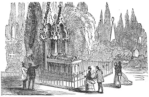 Go when you will, you find somebody snuffling over that tomb. Go when you will, you find it furnished with those bouqnets and immortelles. Go when you will, you find a gravel-train from Marseilles arriving to supply the deficiencies caused by memento-cabbaging vandals whose affections have miscarried.