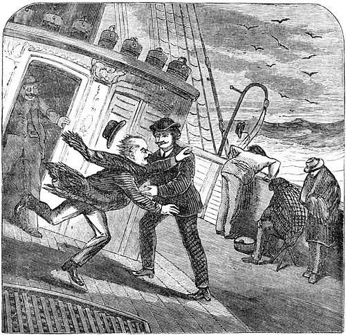 By some happy fortune I was not seasick.—That was a thing to be proud of. I had not always escaped before. If there is one thing in the world that will make a man peculiarly and insufferably self-conceited, it is to have his stomach behave itself, the first day at sea, when nearly all his comrades are seasick. Soon, a venerable fossil, shawled to the chin and bandaged like a mummy, appeared at the door of the after deck-house, and the next lurch of the ship shot him into my arms. I said: