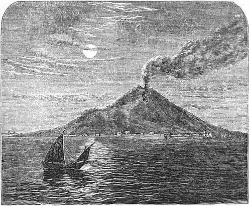 At seven in the evening, with the western horizon all golden from the sunken sun, and specked with distant ships, the full moon sailing high over head, the dark blue of the sea under foot, and a strange sort of twilight affected by all these different lights and colors around us and about us, we sighted superb Stromboli. With what majesty the monarch held his lonely state above the level sea! Distance clothed him in a purple gloom, and added a veil of shimmering mist that so softened his rugged features that we seemed to see him through a web of silver gauze. His torch was out; his fires were smoldering; a tall column of smoke that rose up and lost itself in the growing moonlight was all the sign he gave that he was a living Autocrat of the Sea and not the spectre of a dead one.