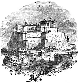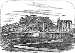 VIEW OF THE ACROPOLIS, LOOKING WEST. which they said was the one St. Paul preached from, and another faction claimed that that hill was Hymettus, and another that it was Pentelicon! After all the trouble, we could be certain of only one thing—the square-topped hill was the Acropolis, and the grand ruin that crowned it was the Parthenon, whose picture we knew in infancy in the school books.