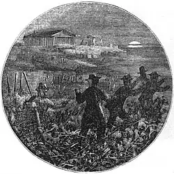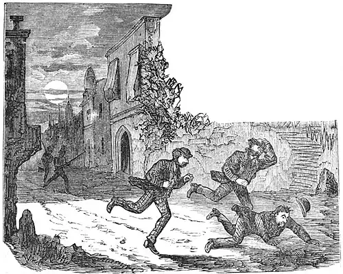 THE ASSAULT. solid rock—(for a while one of them served Socrates for a prison)—we passed around the shoulder of the hill, and the citadel, in all its ruined magnificence, burst upon us! We hurried across the ravine and up a winding road, and stood on the old Acropolis, with the prodigious walls of the citadel towering above our heads. We did not stop to inspect their massive blocks of marble, or measure their height, or guess at their extraordinary thickness, but passed at once through a great arched passage like a railway tunnel, and went straight to the gate that leads to the ancient temples. It was locked! So, after all, it seemed that we were not to see the great Parthenon face to face. We sat down and held a council of war. Result: the gate was only a flimsy structure of wood—we would break it down. It seemed like desecration, but then we had traveled far, and our necessities were urgent. We could not hunt up guides and keepers—we must be on the ship before daylight. So we argued. This was all very fine, but when we came to break the gate, we could not do it. We moved around an angle of the wall and found a low bastion—eight feet high without—ten or twelve within. Denny prepared to scale it, and we got ready to follow. By dint of hard scrambling he finally straddled the top, but some loose stones crumbled away and fell with a crash into the court within. There was instantly a banging of doors and a shout. Denny dropped from the wall in a twinkling, and we retreated in disorder to the gate. Xerxes took that mighty citadel four hundred and eighty years before Christ, when his five millions of soldiers and camp-followers followed him to Greece, and if we four Americans could have remained unmolested five minutes longer, we would have taken it too.