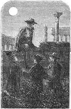 As we wandered thoughtfully down the marble-paved length of this: stately temple, the scene about us was strangely impressive. Here and there, in lavish profusion, were gleaming white statues of men and women, propped against blocks of marble, some of them armless, some without legs, others headless—but all looking mournful in the moonlight, and startlingly human! They rose up and confronted the midnight intruder on every side—they stared at him with stony eyes from unlooked-for nooks and recesses; they peered at him over fragmentary heaps far down the desolate corridors; they barred his way in the midst of the broad forum, and solemnly pointed with handless arms the way from the sacred fane; and through the roofless temple the moon looked down, and banded the floor and darkened the scattered fragments and broken statues with the slanting shadows of the columns.