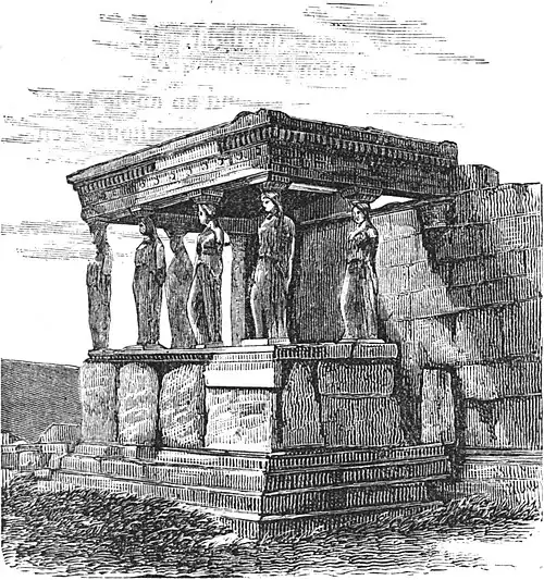 We crossed a large court, entered a great door, and stood upon a pavement of purest white marble, deeply worn by footprints. Before us, in the flooding moonlight, rose the noblest ruins we had ever looked upon—the Propylæ; a small Temple of Minerva; the Temple of Hercules, and. the grand Parthenon. [We got these names from the Greek guide, who didn’t seem to know more than seven men ought to know.] These edifices were all built of the whitest Pentelic marble, but have a pinkish stain upon them now. Where any part is broken, however, the fracture looks like fine loaf sugar. Six caryatides, or marble women, clad in flowing robes, support the portico of the Temple of Hercules, but the porticos and colonnades of the other structures are formed of massive Doric and Ionic pillars, whose flutings and capitals are still measurably perfect, notwithstanding the centuries that have gone over them and the sieges they have suffered. The Parthenon, originally, was two hundred and twenty-six feet long, one hundred wide, and seventy high, and had two rows of great columns, eight in each, at either end, and single rows of seventeen each down the sides, and was one of the most graceful and beautiful edifices ever erected.