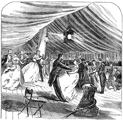 On several starlight nights we danced on the upper deck, under the awnings, and made something of a ball-room display of brilliancy by hanging a number of ship’s lanterns to the stanchions. Our music consisted of the well-mixed strains of a melodeon which was a little asthmatic and apt to catch its breath where it ought to come out strong; a clarinet which was a little unreliable on the high keys and rather melancholy on the low ones; and a disreputable accordion that had a leak somewhere and breathed louder than it squawked—a more elegant term does not occur to me just now. However, the dancing was infinitely worse than the music. When the ship rolled to starboard the whole platoon of dancers came charging down to starboard with it, and brought up in mass at the rail; and when it rolled to port, they went floundering down to port with the same unanimity of sentiment. Waltzers spun around precariously for a matter of fifteen seconds and then went scurrying down to the rail as if they meant to go overboard. The Virginia reel, as performed on board the Quaker City, had more genuine reel about it than any reel I ever saw before, and was as full of interest to the spectator as it was full of desperate chances and hairbreadth escapes to the participant. We gave up dancing, finally.