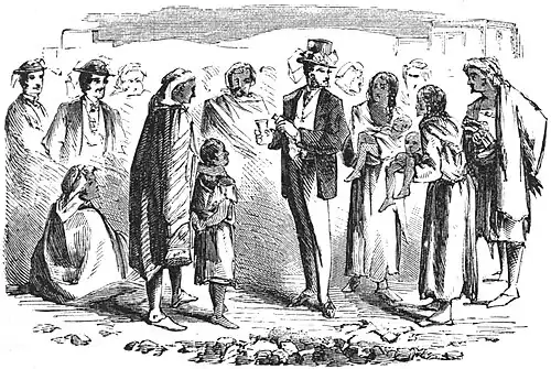 This morning, during breakfast, the usual assemblage of squalid humanity sat patiently without the charmed circle of the camp and waited for such crumbs as pity might bestow upon their misery. There were old and young, brown-skinned and yellow. Some of the men were tall and stalwart, (for one hardly sees any where such splendid-looking men as here in the East,) but all the women and children looked worn and sad, and distressed with hunger. They reminded me much of Indians, did these people. They had but little clothing, but such as they had was fanciful in character and fantastic in its arrangement. Any little absurd gewgaw or gimcrack they had they disposed in such a way as to make it attract attention most readily. They sat in silence, and with tireless patience watched our every motion with that vile, uncomplaining impoliteness which is so truly Indian, and which makes a white man so nervous and uncomfortable and savage that he wants to exterminate the whole tribe.