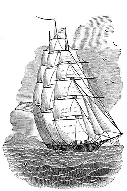 The picture on the other hand was very beautiful to eyes weary of the changeless sea, and bye and bye the ship’s company grew wonderfully cheerful. But while we stood admiring the cloud-capped peaks and the lowlands robed in misty gloom, a finer picture burst upon us and chained every eye like a magnet—a stately ship, with canvas piled on canvas till