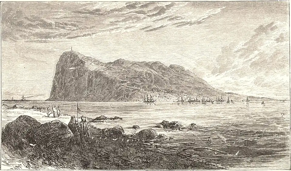 standing seemingly in the center of the wide strait and apparently washed on all sides by the sea, swung magnificently into view, and we needed no tedious traveled parrot to tell us it was Gibraltar. There could not be two rocks like that in one kingdom.