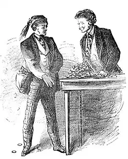 CHANGE FOR A NAPOLEON. basket to another. They don’t coin much money now-a-days, I think. I saw none but what was dated four or five hundred years back, and was badly worn and battered. These coins are not very valuable. Jack went out to get a Napoleon changed, so as to have money suited to the general cheapness of things, and came back and said he had “swamped the bank; had bought eleven quarts of coin, and the head of the firm had gone on the street to negotiate for the balance of the change.” I bought nearly half a pint of their money for a shilling myself. I am not proud on account of having so much money, though. I care nothing for wealth.