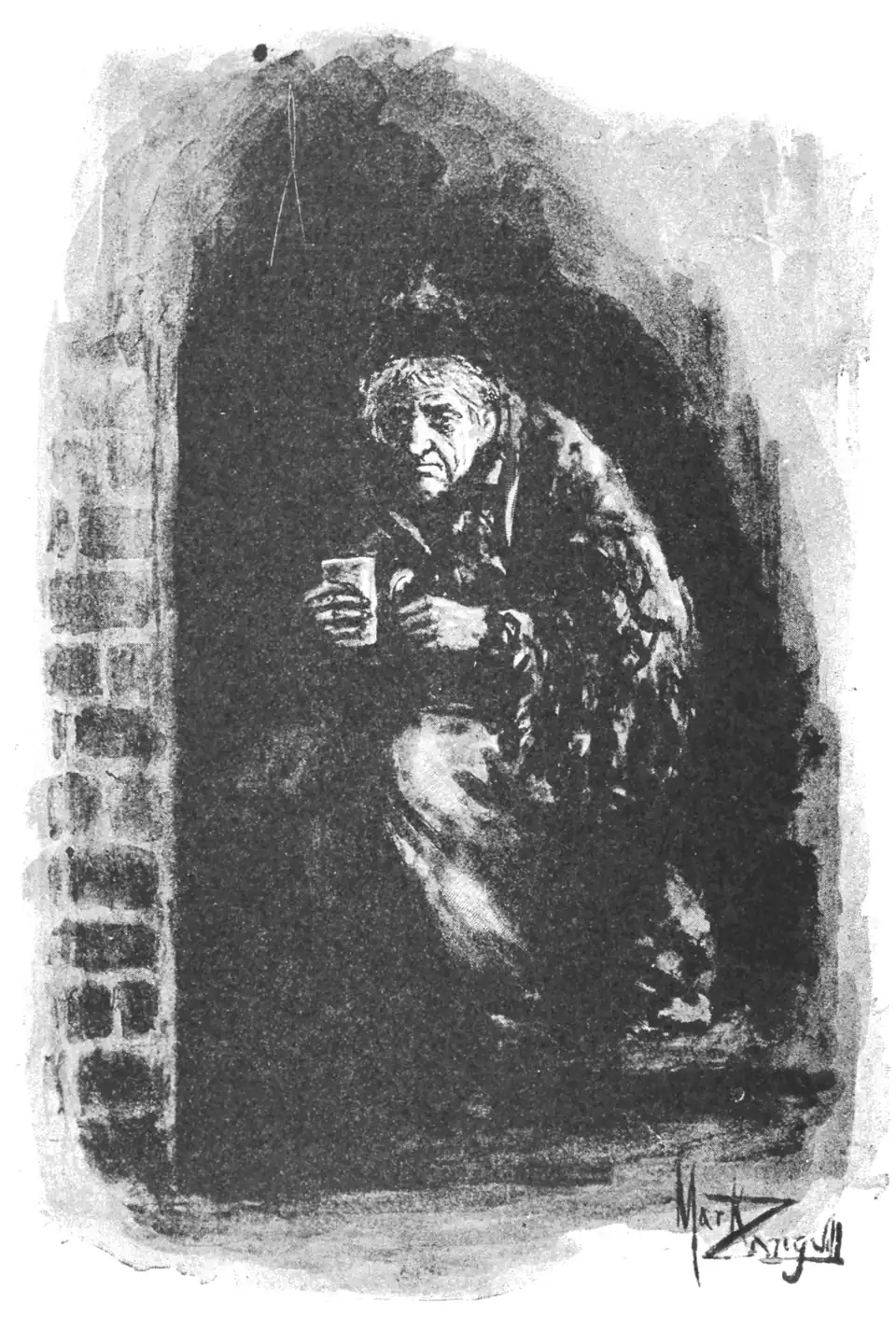 "What are you crying about?" said a quavering voice, and Bob, startled, became aware of a wretched old creature dining on the doorstep at his side.