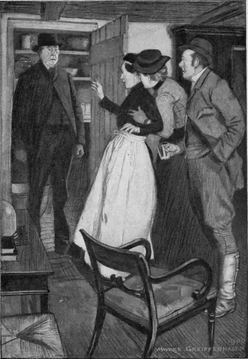 The widow and Mr. Bodfish rose simultaneously. It required not the brain of a trained detective to know that the cheese was in the larder. The unconscious Mrs. Driver opened the door, and then with a wild scream fell back before the emerging form of Mr. Bodfish into the arms of Mrs. Clowes. The glass of Mr. Negget smashed on the floor, and the farmer himself, with every appearance of astonishment, stared at the apparition open-mouthed.