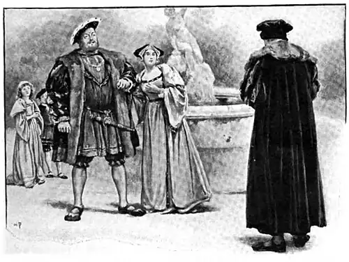 And down the white path some one was coming—a huge unwieldy man who rolled in his walk as if he were too heavy for his legs. His coat was of crimson velvet covered with gold lace, its buttons of diamonds. His cap was overlaid with ermine caught in a clasp of gold, There was gold-work over his swollen legs and feet. Above all the glitter was a big flabby face, very white, mottled with dull red. A thin fur of yellow beard hardly concealed the ruthless lines of the mouth and the hanging jowl. His eyes were little and sunken in loose flesh, but they glittered. So Henry the Defender of the Faith came wooing his fifth wife.