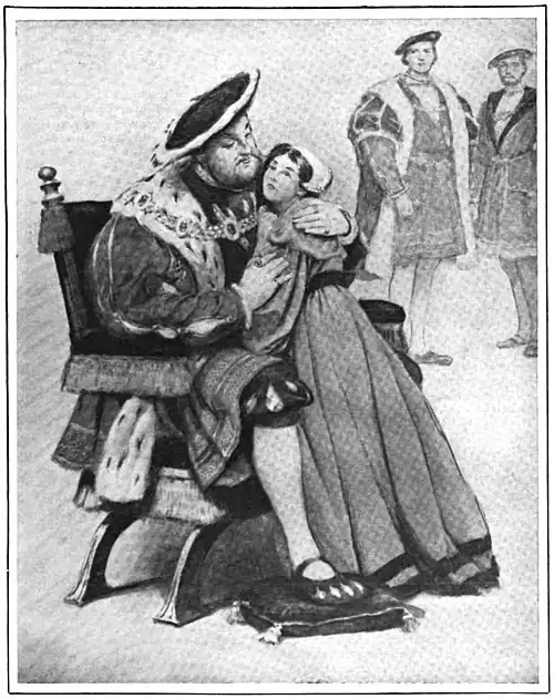 “Mock? Who, I?” he gasped. “Nay, faith, I never liked her so well. Come, Bess, art of my own blood, indeed.” He tossed her up in the air and kissed her. “There, seal peace with me. We will have a new order for thee. Kate, I give her to thee, as thou lovest me.”