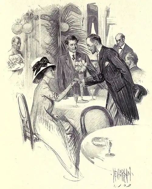 Mrs. Stellery, however, had not yet appeared; but at a few minutes before six she walked in the door, handed a prescription to the clerk at the desk, and seated herself without appearing to recognize the Seer, who lounged at a counter some distance away. She was beautifully dressed in the prevalent mode, and sat like a fashion-plate, without expression on her proud face, as if bored to death.