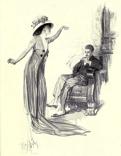 "Everywhere; that's the funny part of it. This very day I saw her breakfasting at Mouquin's, at the next table. She's always near me. About two months ago she began. I say began, because it has happened too often to be accidental. She passed me in the street. Next day she stood on a corner waiting for a car. A mighty pretty girl, too—small head—you know how that makes a girl look taller and helps her figure; most women are built like dwarfs nowadays—deep brown eyes, a delicious mouth, and a touch of originality in her expression on account of a small scar on the left side of her chin. It's positively a beauty-spot, more like a dimple than a scar, and it crinkles up when she smiles. Well, I've run into her almost every day since then—and she's never moved an eyelash to show she recognized me. But she's up to something. She's always right in my way and never notices me. She's got me going, there's no doubt about that."