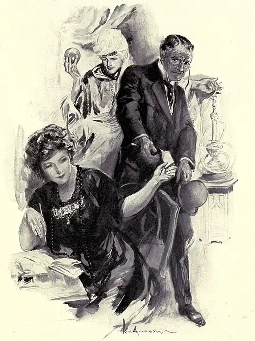 "I'm so glad you've come!" she announced. "Seems as if I couldn't wait any longer; for I felt sure that you could help us if anybody could, and I do feel so terribly about this robbery! You know it was my wedding gift to Mr. Barrister. My husband agreed with me that it wasn't exactly a case for the police, and we don't want any more talk about it than is absolutely necessary. I've heard so much about you, Mr. Astro; for a great many of my friends have gone to you, and you told them such remarkable things! Then that case of your finding the Sacarnet sapphire gave me considerable confidence in you. Why, my own mother once recovered a purse she had lost, by going to a medium about it!" She bustled about amiably.
