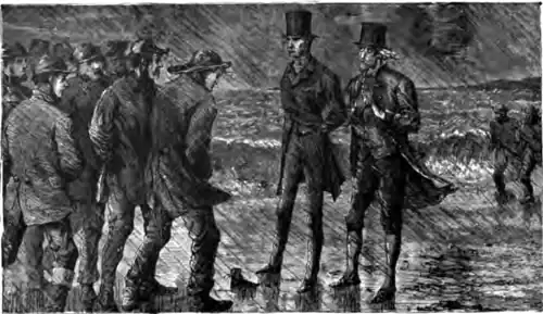 I went down to him, choking for breath, with my heart leaping as if it was like to leap out of me. I was past speaking. I had a hundred questions to put to him; and not one of them would pass my lips. His face frightened me. I saw a look in his eyes which was a look of horror. He snatched the boot out of my hand, and set it in a foot-mark on the sand, bearing south from us as we stood, and pointing straight toward the rocky ledge called the South Spit. The mark was not yet blurred out by the rain—and the girl's boot fitted it to a hair.