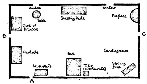 We went up together to the room of the tragedy. For convenience I append a plan of the room and the principal articles of furniture in it.